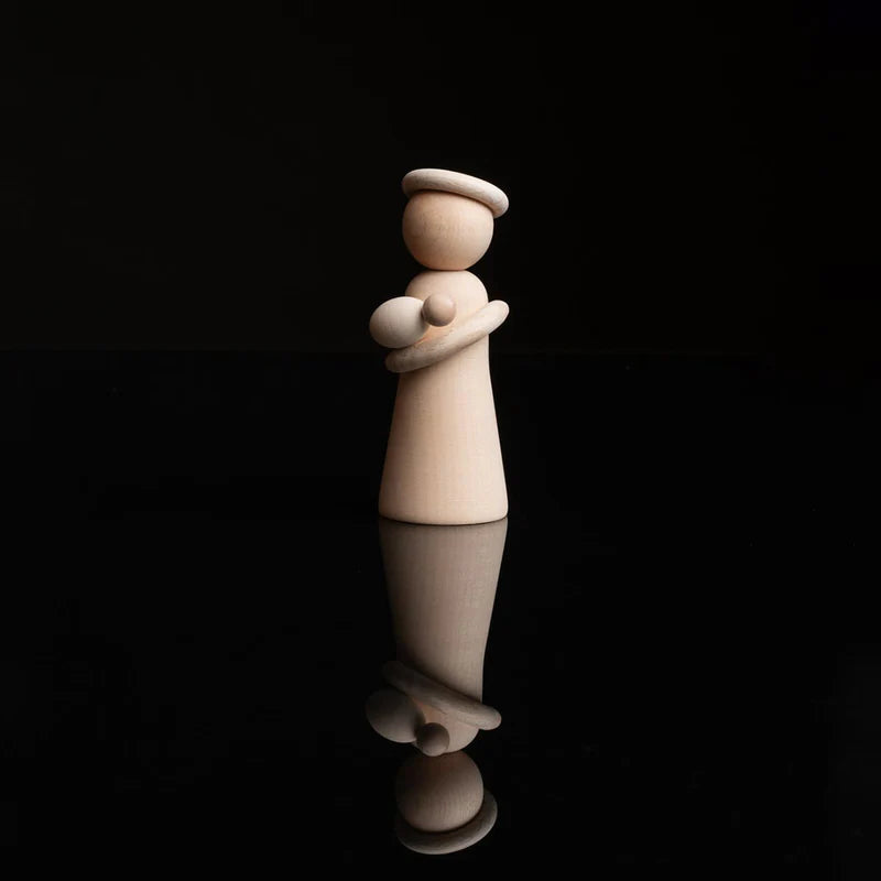 Maria is a wooden figurine, made of maple. The figurine is wearing a hat and a holding a swaddled baby. The figurine is fit for home décor and the Christmas table setting.