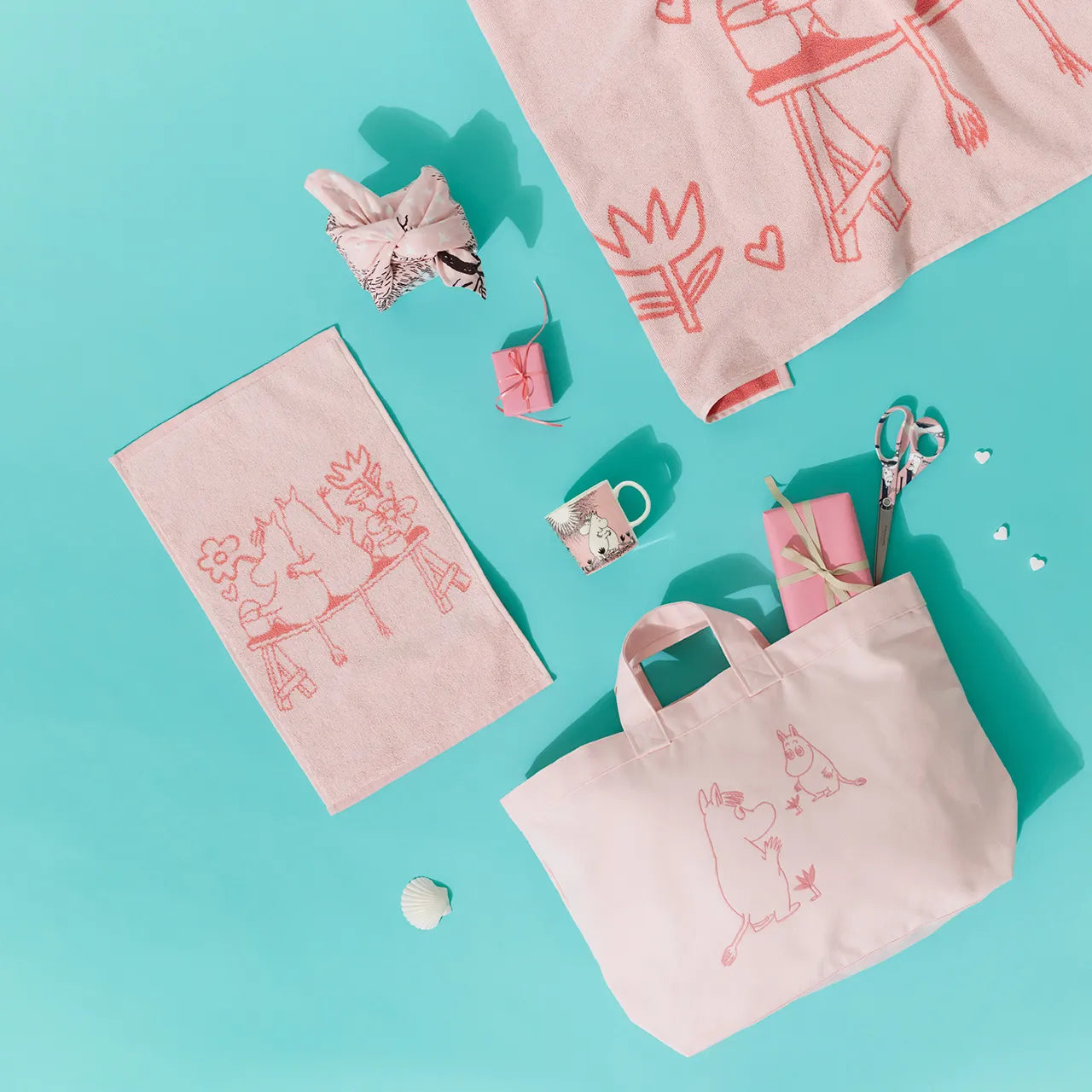 Enjoy the soft coziness of the Moomin hand towel themed with love. The heart-warming scene pictures Snorkmaiden and Moomintroll painting flowers on the wall together. The illustration is based on a comic strip “Moomin Builds a House” in which Moomintroll starts building a house for himself and Snorkmaiden.