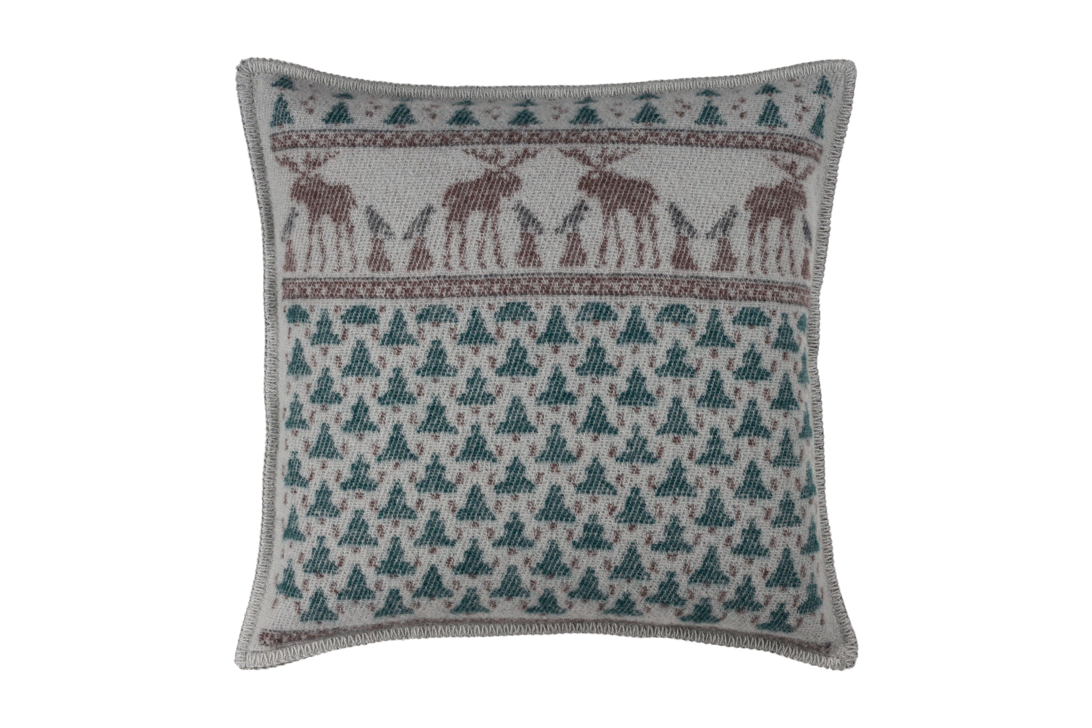 Skogen, wool pillowcase made in our Skogen design. This pattern is inspired by the everyman’s right, a Swedish symbol here depicted by the king of the forest, the moose, in dialogue with the raven. At Öjbro Vantfabrik we have made it our goal to keep our various design traditions alive