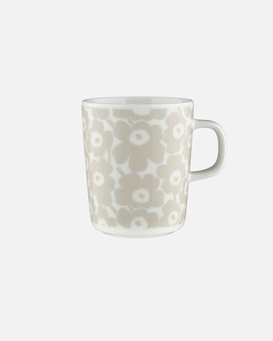 The Oiva mug with Pikkuinen Unikko pattern is made of white stoneware that is dishwasher, oven, microwave and freezer proof.